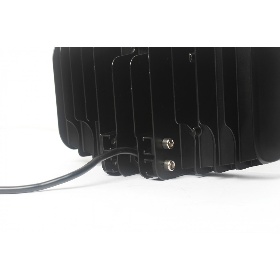 Schwarzer LED Fernscheinwerfer, Rückseite mit Kühlrippen, Anschlusskabel und Montageschrauben.