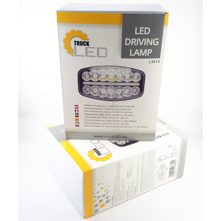 Ein schwarzer LED Fernscheinwerfer SLIM mit Positionslicht, in seiner weißen Produktverpackung mit gelben und grauen Details.