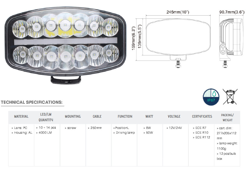Technisches Diagramm des LED Fernscheinwerfers SLIM mit Vorder- und Seitenansicht und Bemaßung.