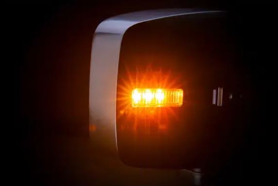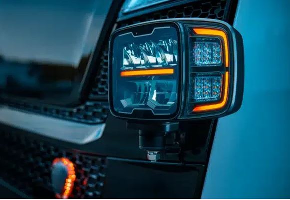 Schwarzer Strands HI-LO Fernscheinwerfer mit klarer Linse, leuchtenden weißen Positionslichtern und gelben Blinkern.
