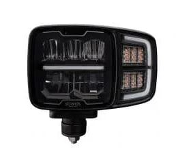 Rechteckiger schwarzer Strands Fernscheinwerfer mit klarem Glas, LED-Elementen und weißem/orangefarbenem Positionslicht.