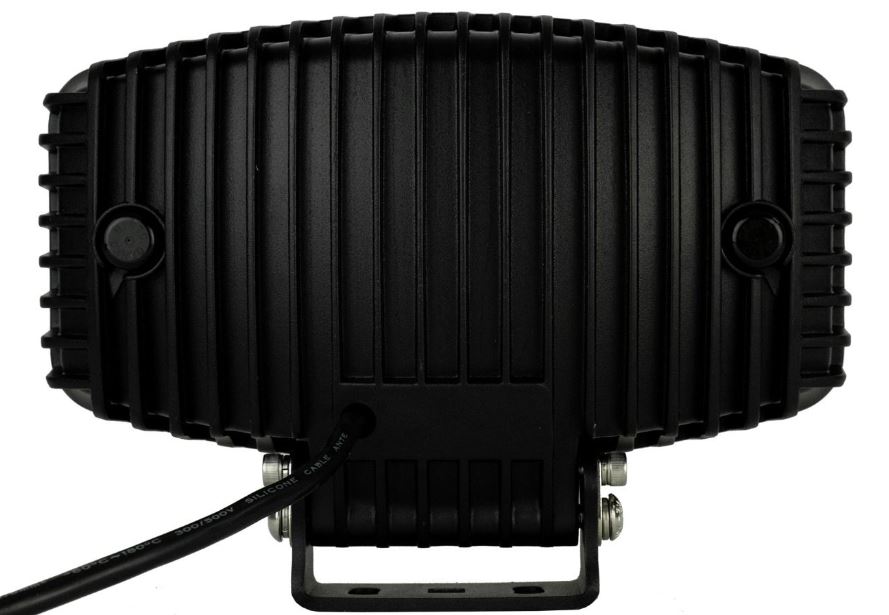 Rückseite des schwarzen Ledson LED Zusatzscheinwerfers Orion10+ mit Kühlrippen und Edelstahlhalterung.