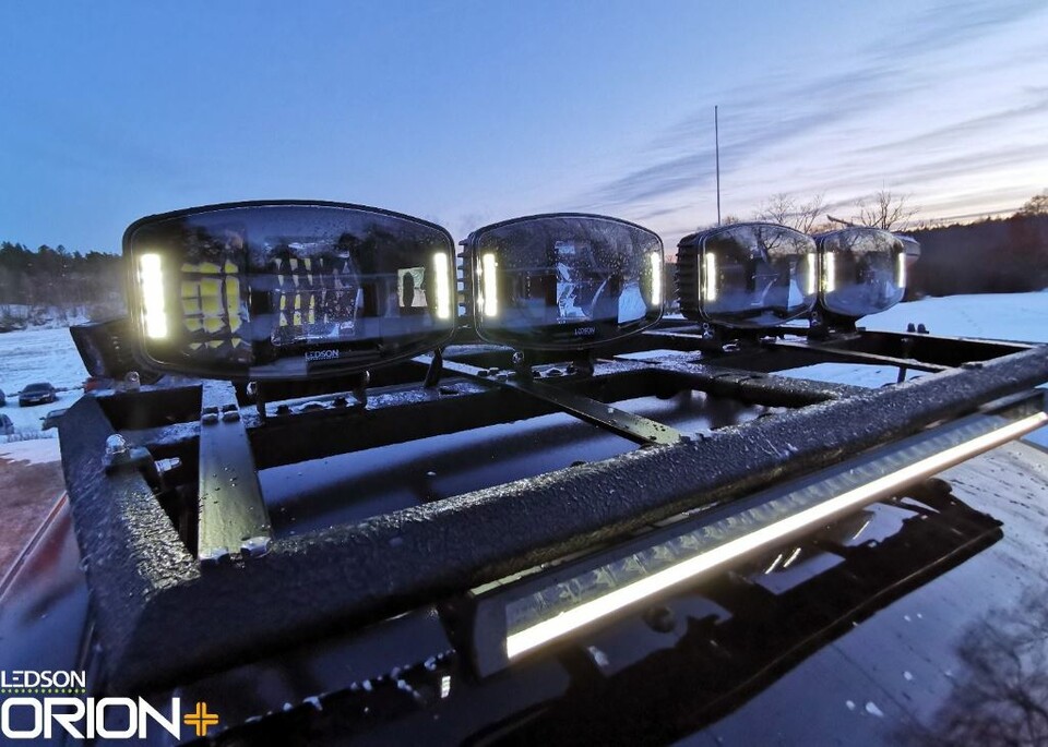 Mehrere Ledson Orion10+ LED Zusatzscheinwerfer mit weißem Positionslicht auf einem schwarzen Dachträger.