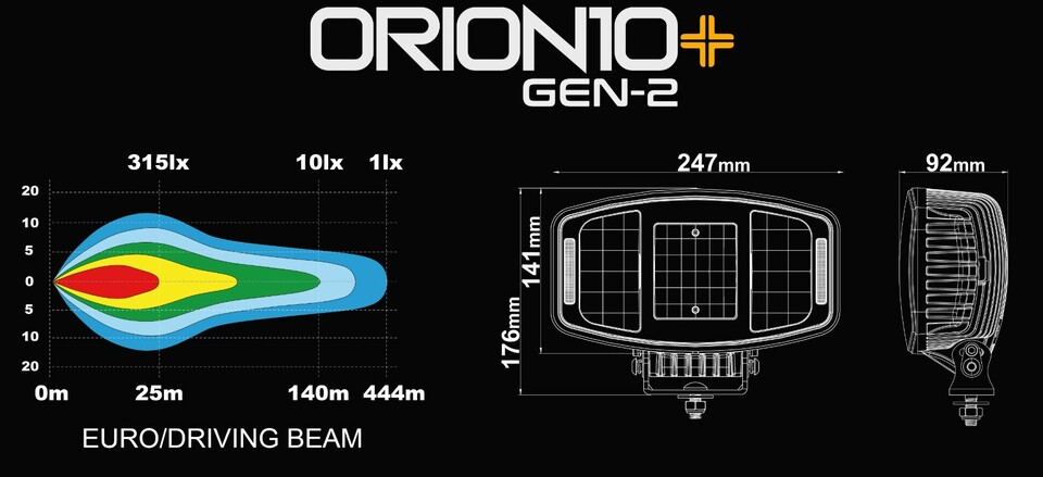 Technische Zeichnung des Ledson Orion10+ Gen2 LED-Zusatzscheinwerfers mit Maßen und Lichtverteilung.
