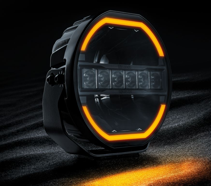 Schwarzer Strands Siberia Skylord Fernscheinwerfer mit orange leuchtender Dual-Positionsleuchte und zentralen LEDs.