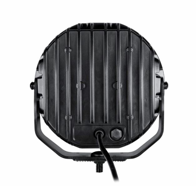 Rückansicht des schwarzen Strands Siberia Skylord Fernscheinwerfers mit vertikalen Kühlrippen und Halterung.