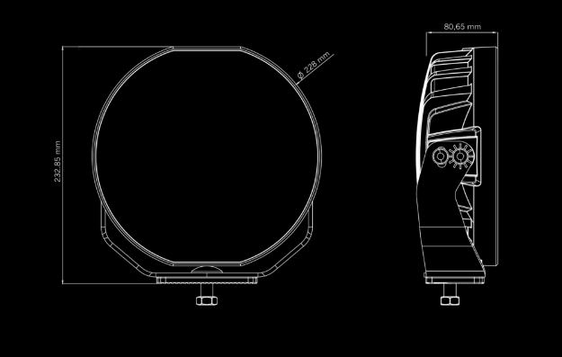 Technische Zeichnung des Strands Siberia Skylord 9 Fernscheinwerfers. Zeigt Vorder- und Seitenansicht mit Montagehalterung.