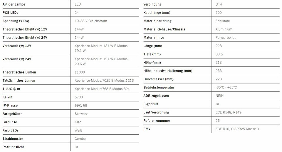Technische Daten des Strands Siberia Skylord 9 Fernscheinwerfers: LEDs, Leistung, Maße, Materialien und Schutzklassen.