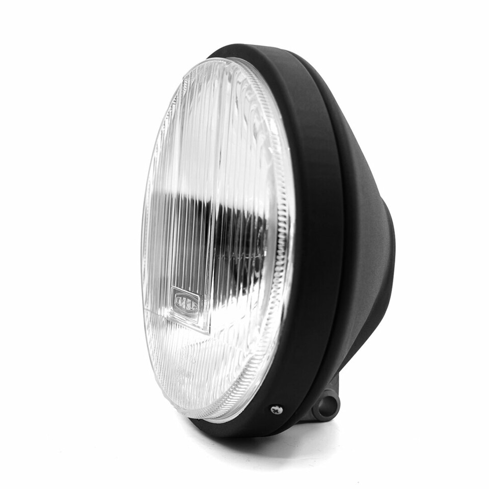 OMNIUS Retroline Halogen Fernscheinwerfer mit schwarzem Metallgehäuse und klarer Glaslinse.