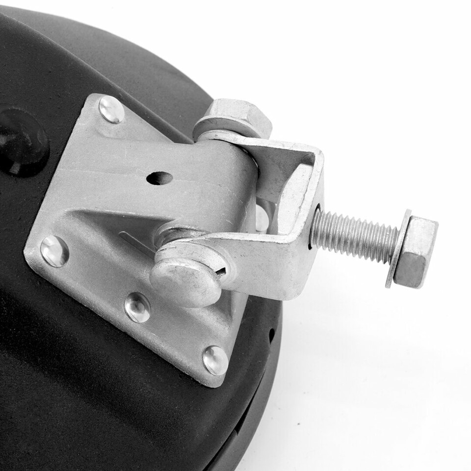 Detailansicht der silbernen, verstellbaren Metallhalterung eines schwarzen OMNIUS Retroline Fernscheinwerfers.