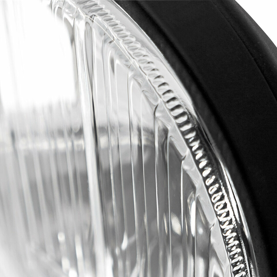Nahaufnahme der klaren Glaslinse eines OMNIUS Retroline Fernscheinwerfers mit schwarzem Metallgehäuse.