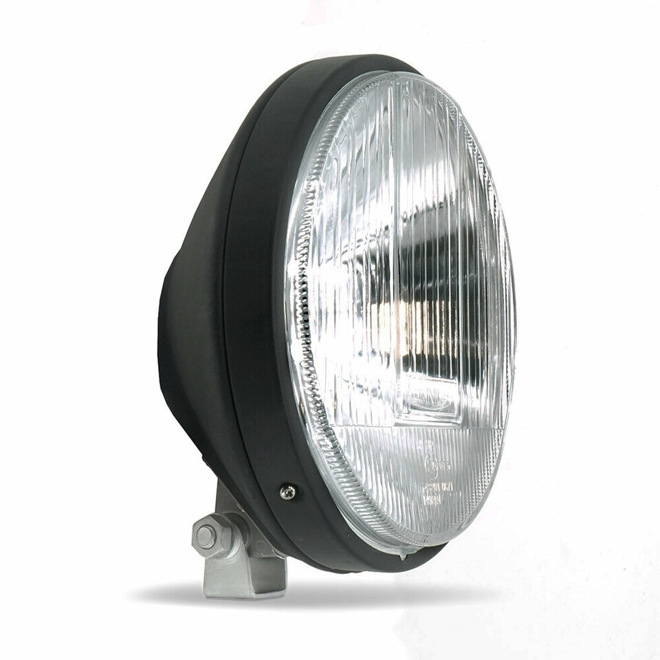 Runder schwarzer Halogen-Fernscheinwerfer mit klarer Glaslinse und robustem Metallgehäuse, seitlich gezeigt.