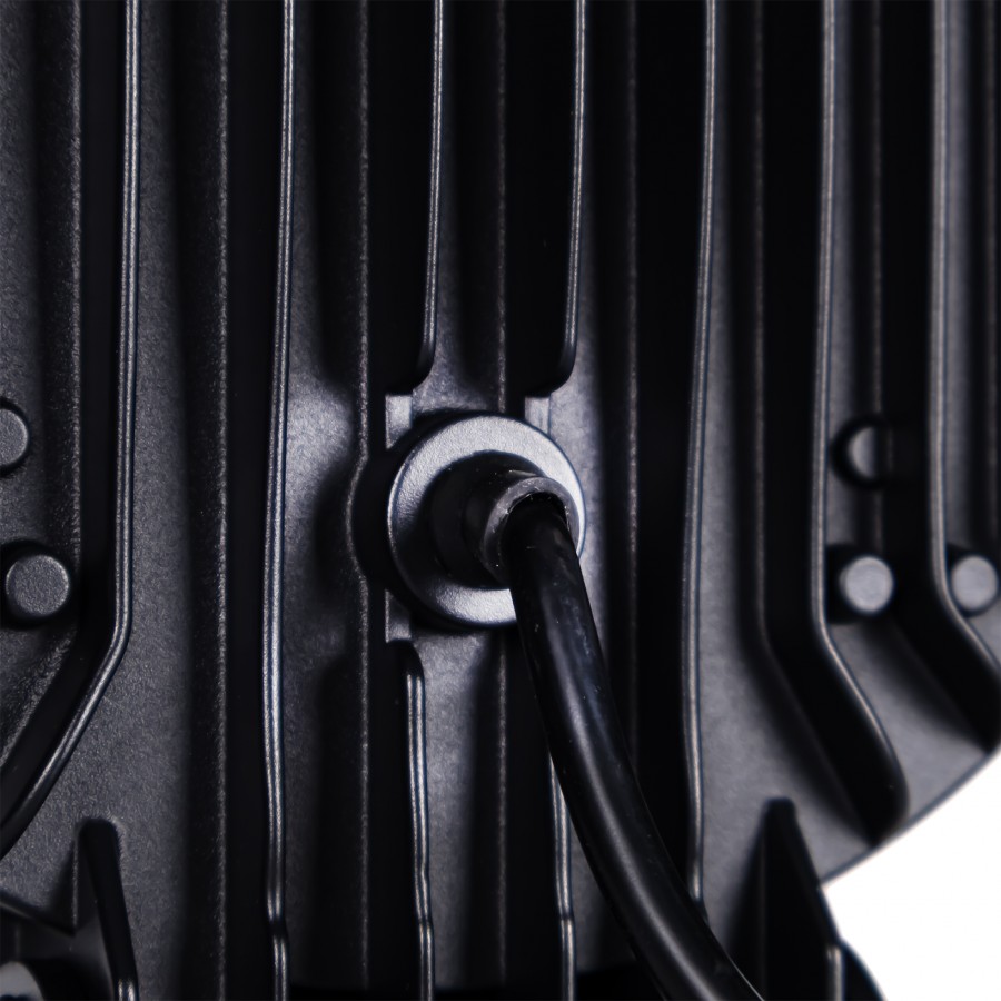 Rückseite des schwarzen Aluminiumgehäuses des LED Fernscheinwerfers "SPIDER TOXIC" mit Kühlrippen und Kabeleingang.