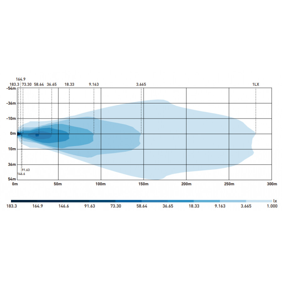 Lichtverteilungsdiagramm des LED Fernscheinwerfers SPIDER TOXIC. Zeigt die Lichtausbreitung und Intensität in Blauabstufungen.