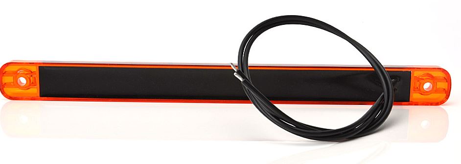 Schlanke, orangefarbene LED Umrissleiste mit schwarzem Mittelteil, Befestigungslöchern und Anschlusskabel.