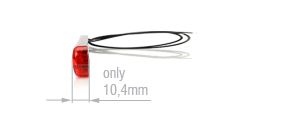 Rote, superdünne LED-Umrissleuchte mit Kabel, Seitenansicht. Die 10,4mm Tiefe ist markiert.