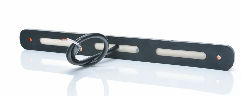 Dynamische LED-Blinkleuchte als orange-schwarze Leiste mit Anschlusskabel auf weißem Hintergrund.