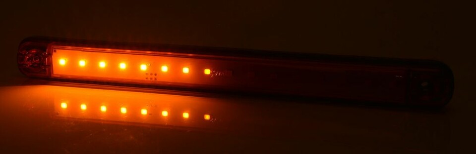 Orange leuchtende LED Leiste Blinkleuchte mit mehreren LEDs, reflektiert auf dunklem Grund.
