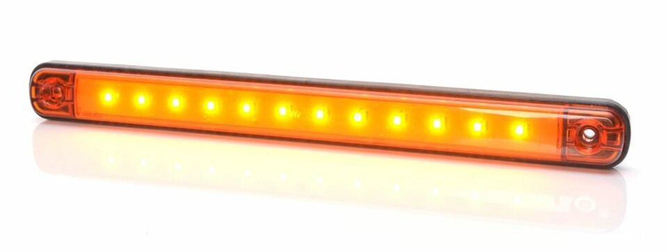 Orange leuchtende LED-Blinkleuchte in Leistenform mit klar sichtbaren LEDs.