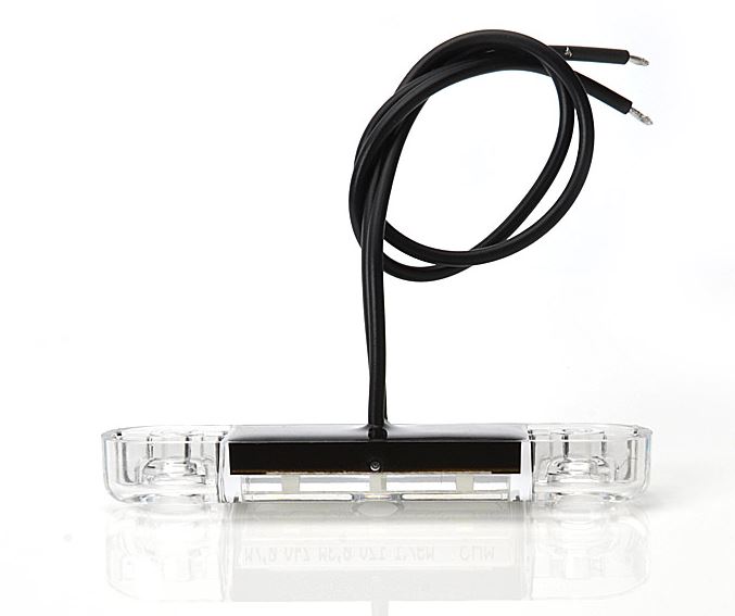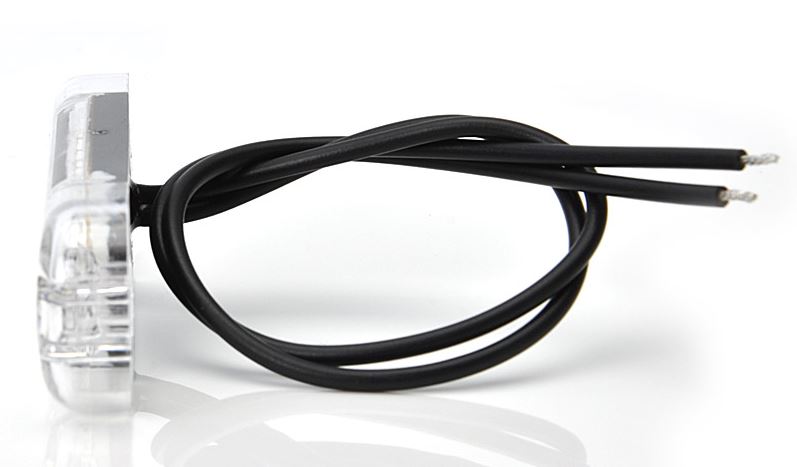 Klare, schlanke LED Positionsleuchte mit schwarzen Anschlusskabeln, seitlich auf weißem Grund.