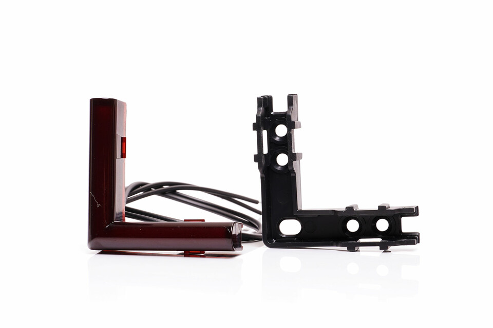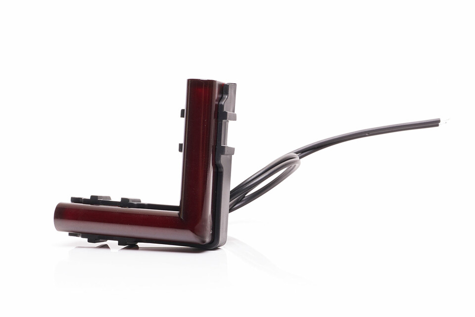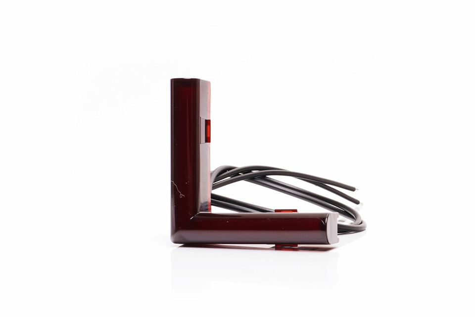 Eine L-förmige, dunkelrote Markierungsleuchte mit schwarzen Anschlusskabeln auf weißem Hintergrund.