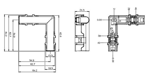 Technische Zeichnungen der schwarzen Winkel-Markierungsleuchte mit Maßen aus verschiedenen Ansichten.