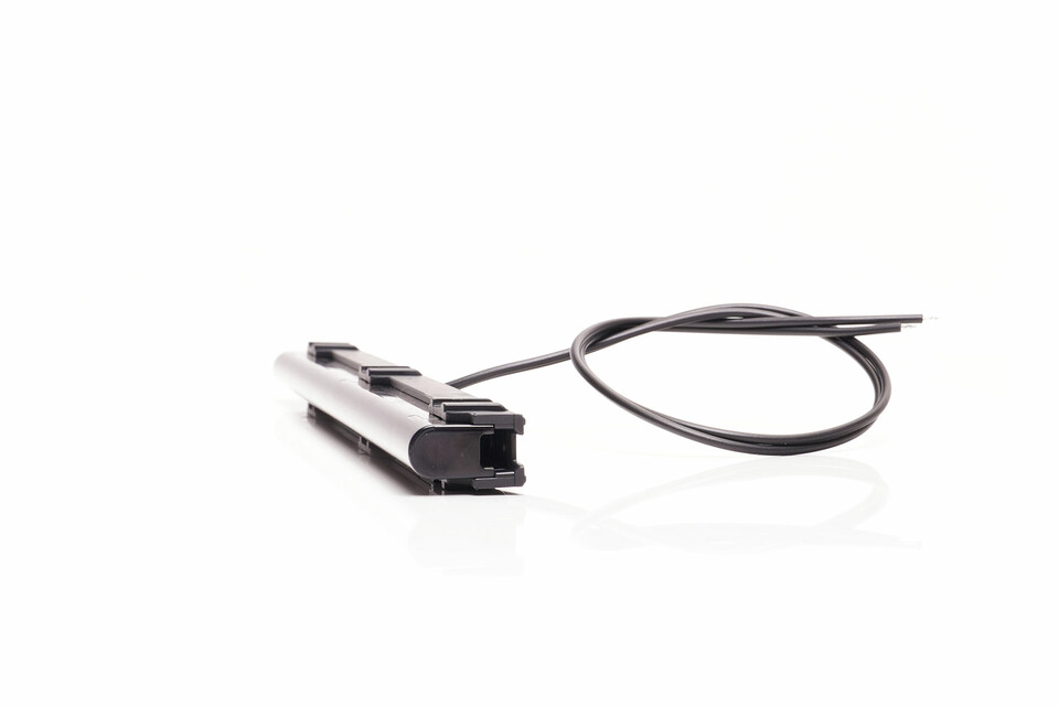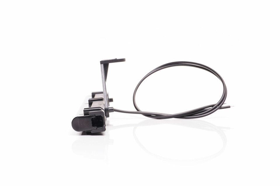 Eine schwarze Markierungsleiste mit angeschlossenem Kabel auf weißem Hintergrund.