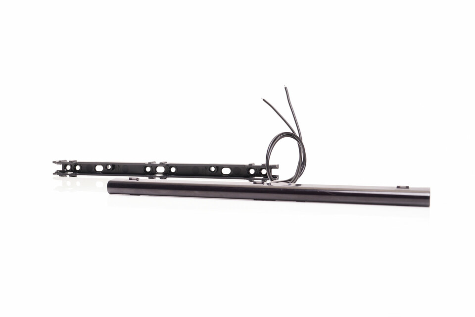 Schwarze Markierungsleiste mit Neon Optik, zerlegt in zwei Teile, mit Anschlusskabeln.