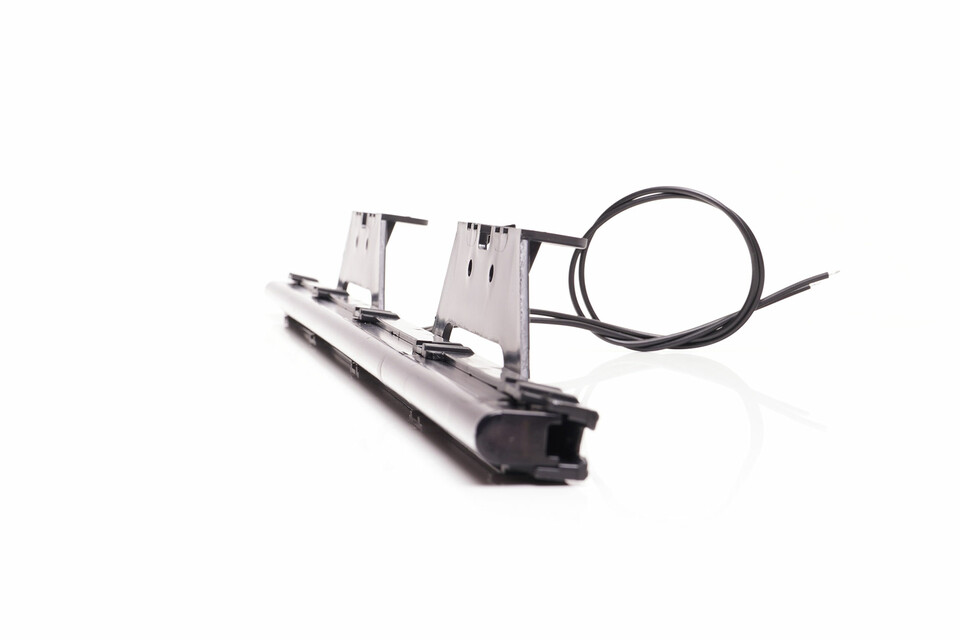 Schwarze Markierungsleiste mit Neon Optik, Montageschiene und Kabel auf weißem Hintergrund.