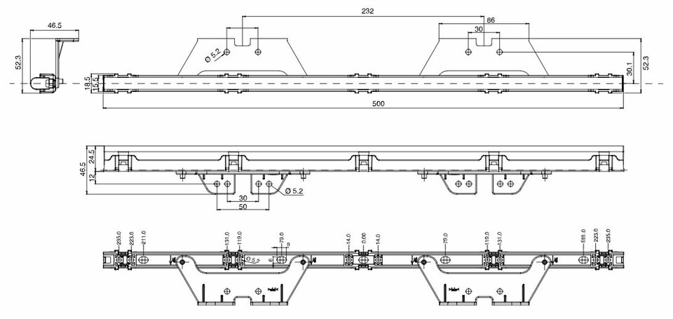 Technische Zeichnung der 500mm Markierungsleiste mit Seiten-, Draufsicht und Maßen.