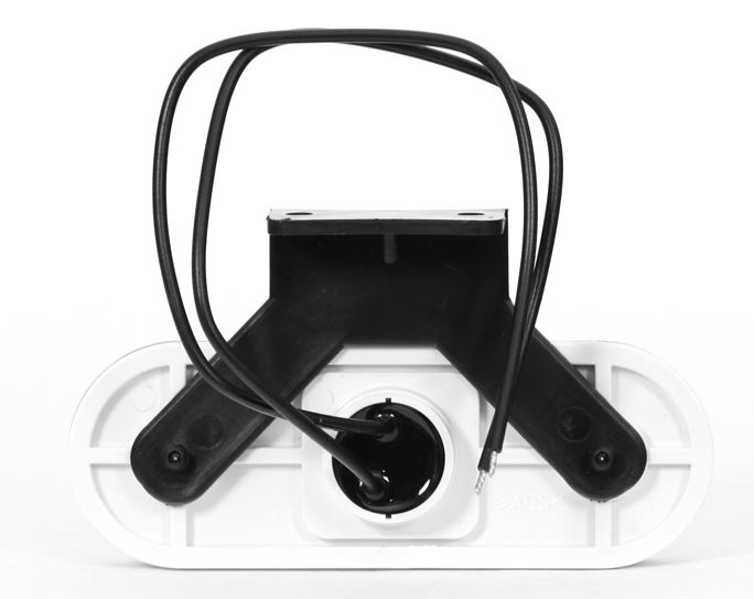 Rückseite einer weißen, ovalen seitlichen Umrissleuchte mit schwarzer Montagehalterung und Anschlusskabeln.