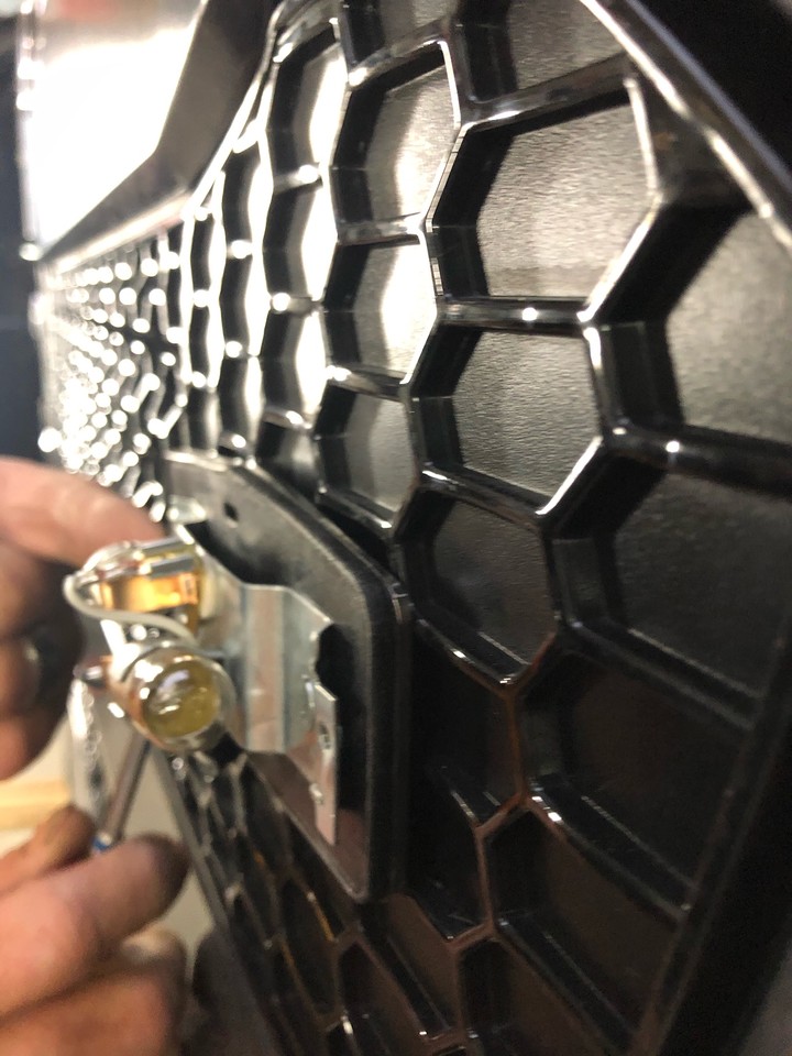 Edelstahlplatte für Lampe, montiert auf schwarzem Kühlergrill mit Wabenmuster.