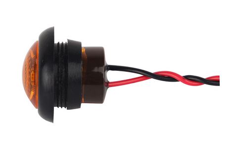 Runde, flache LED-Markierungsleuchte mit bernsteinfarbenem Glas, schwarzem Gehäuse und roten sowie schwarzen Kabeln.