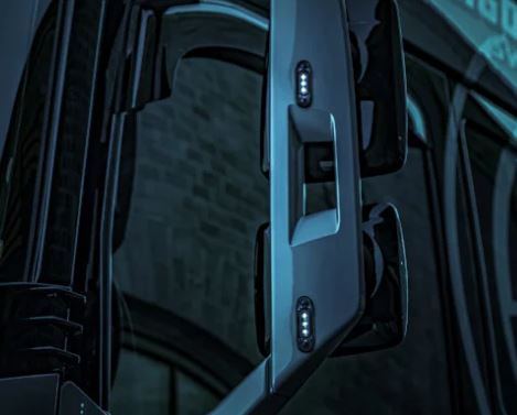 Dark Knight Positionsleuchten mit LEDs und anthrazit getöntem Glas, montiert am dunklen LKW-Spiegel.
