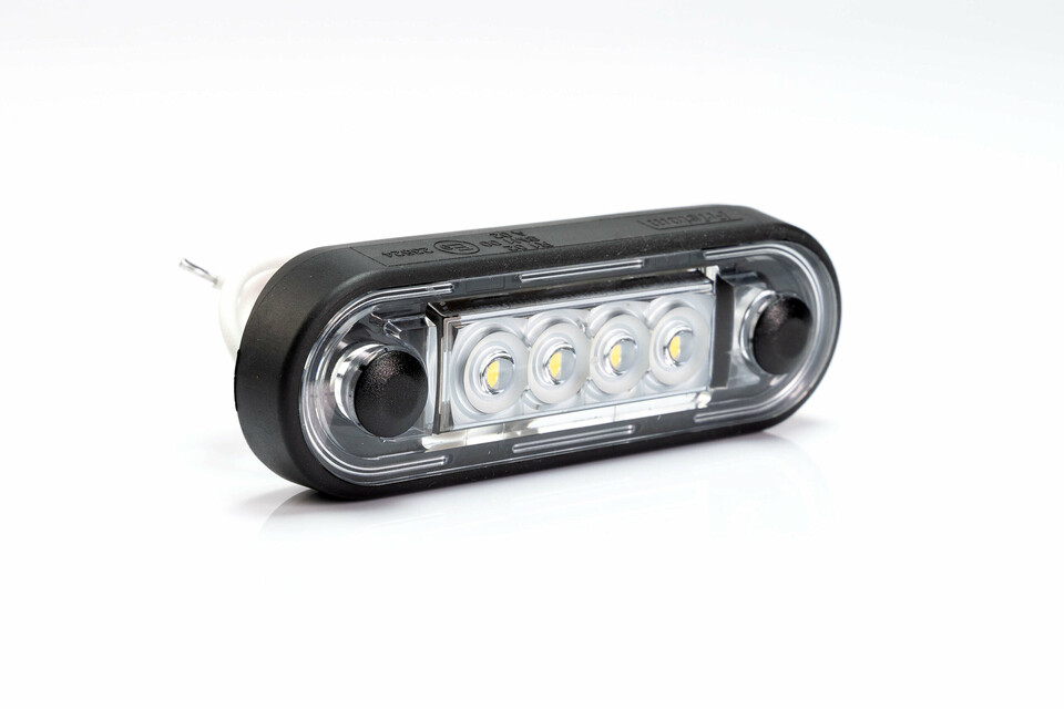 LED-Begrenzungsleuchten mit schwarzem Gehäuse, eine leuchtet weiß, die andere gelb.