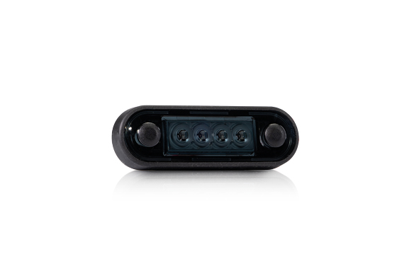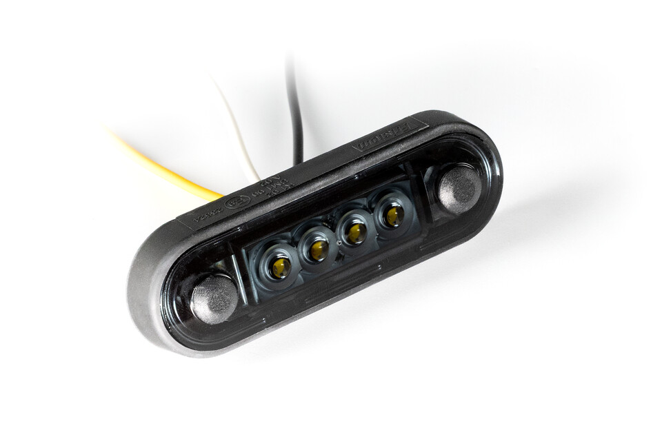 Dunkle, ovale LED-Begrenzungsleuchte mit vier gelben LEDs und Schraubkappen, auf weißem Hintergrund.
