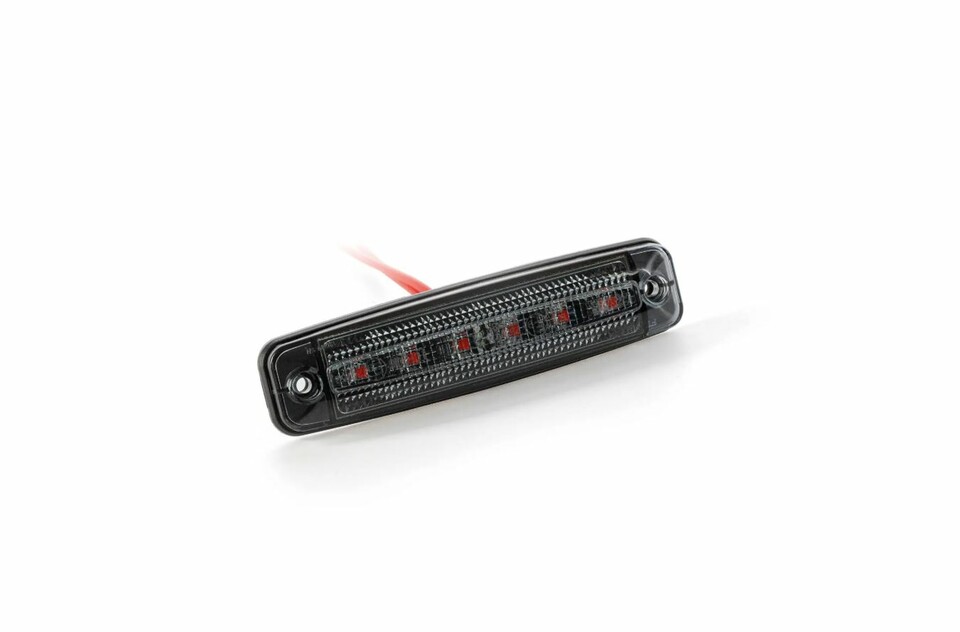 Flache, dunkle LED-Umrissleuchte mit klarem Glas und sichtbaren LEDs, bereit zur Montage.