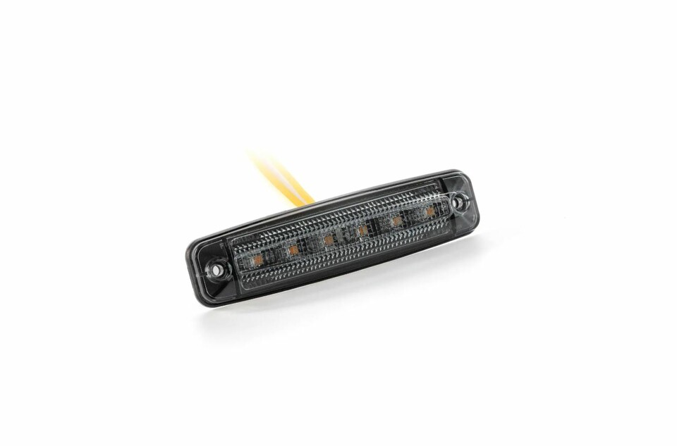 Dunkle, flache LED Markierungsleuchte mit getöntem PC-Gehäuse, orangefarbenen LEDs und gelbem Anschlusskabel.