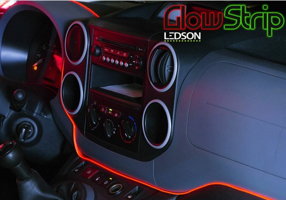 Roter Ledson Glowstrip als Innenbeleuchtung im Fahrzeug-Cockpit, flexibel um Armaturenbrett und Mittelkonsole verlegt.