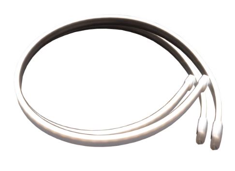 Ein Paar flexible, graue LED-Streifen, gebogen, mit dunkler Rückseite und transparenten Enden.