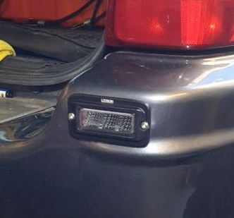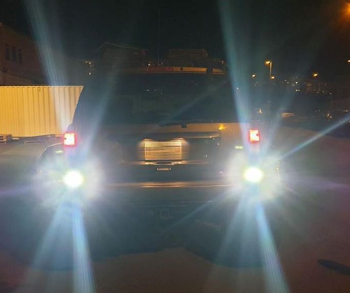 Dunkles Fahrzeug von hinten mit hell leuchtenden, bündig montierten Ledson Raptor LED-Rückfahr-/Arbeitsscheinwerfern.