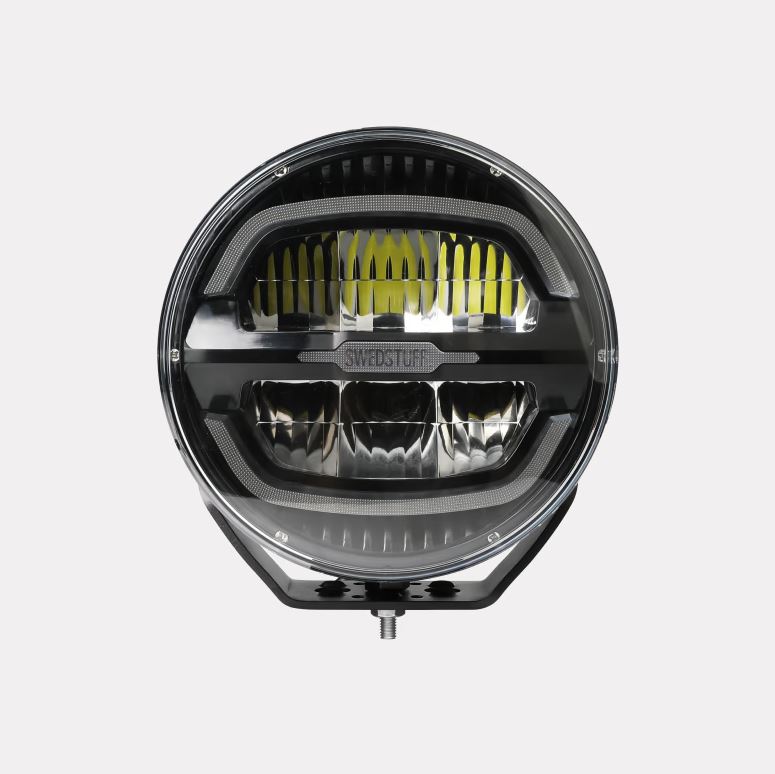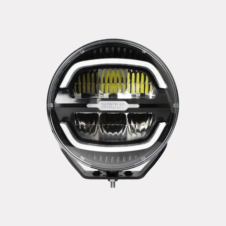 Runder schwarzer SWEDSTUFF LED-Scheinwerfer mit klarem Polycarbonatglas, weißem Positionslichtring und gelben Fernlicht-LEDs.