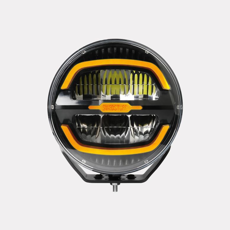 Runder SWEDSTUFF LED-Scheinwerfer mit bernsteinfarbenem Positionslicht und schwarzem Gehäuse.