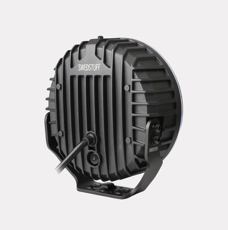 Runder schwarzer SWEDSTUFF LED-Fahrscheinwerfer mit Kühlrippen und Halterung, von hinten gezeigt.
