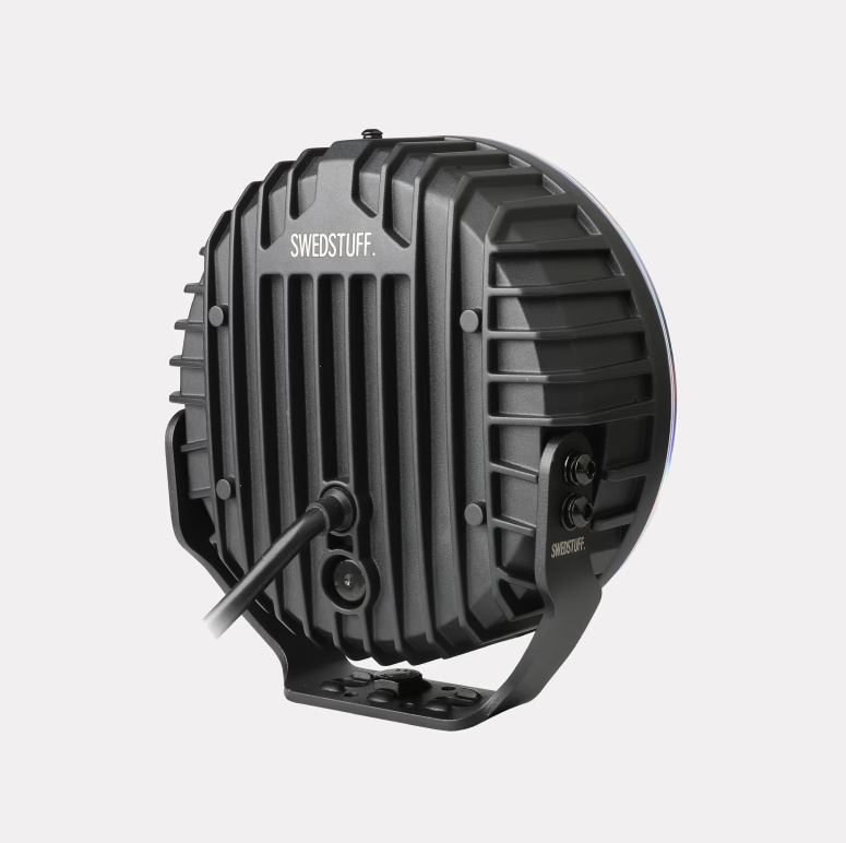 Runder, schwarzer SWEDSTUFF LED-Fahrlicht Scheinwerfer mit gerippter Rückseite und Montagehalterung.