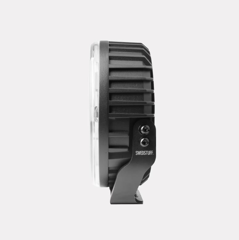 Seitenansicht des runden SWEDSTUFF LED-Fahrlichts mit schwarzem Aluminiumgehäuse, klarer Linse und Halterung.