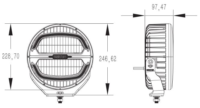 Technische Zeichnung des runden SWEDSTUFF LED-Fahrlichts, Vorder- und Seitenansicht mit Halterung.