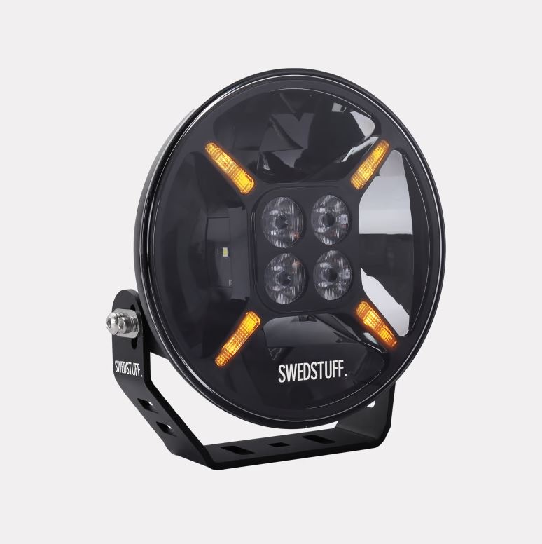 Runder, schwarzer SWEDSTUFF LED-Scheinwerfer mit weißen und bernsteinfarbenen Positionslichtern in X-Form auf schwarzer Halterung.