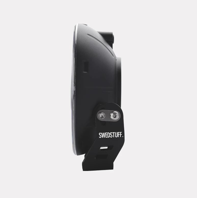 Seitenansicht des schwarzen SWEDSTUFF LED-Scheinwerfers mit Halterung.