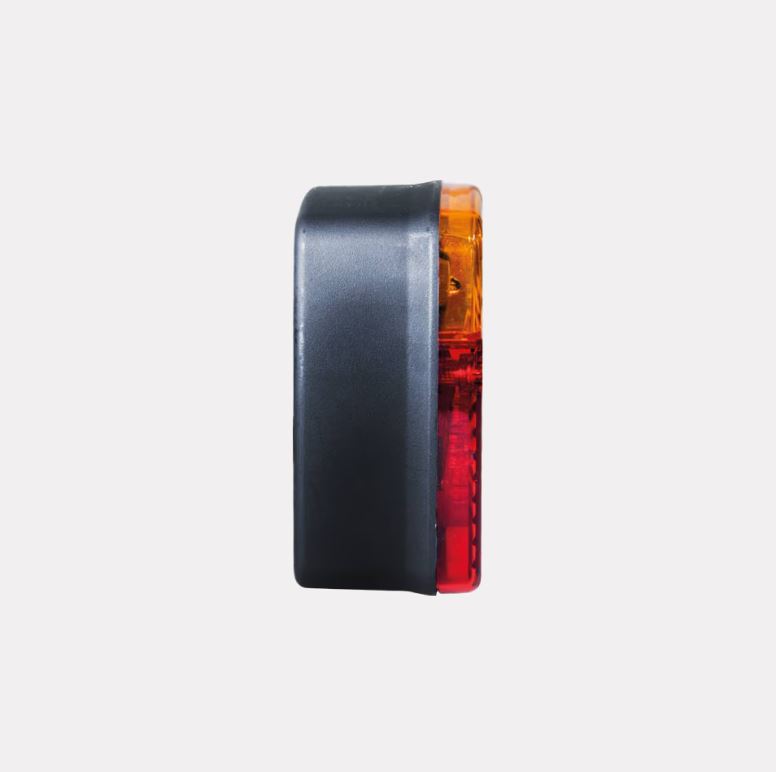 SWEDSTUFF Rücklicht mit dunklem Gehäuse und geteilter roter und bernsteinfarbener Linse.